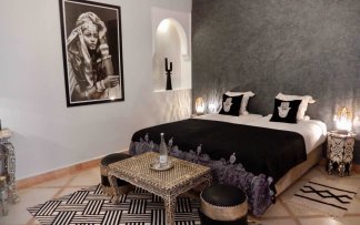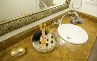 Our Suite Bahia captures this essence of sophisticated elegance and meticulous design. The suite's color palette of black, gray, and silver, combined with elaborate decorative work and furniture featuring intricate inlay, creates an atmosphere of refined luxury that echoes the palace's famous interiors. At 26m², this suite demonstrates that true brilliance isn't about size—it's about the thoughtful integration of every element. The double wash basin and premium finishes reflect the palace's tradition of providing the finest amenities, while the option to connect with Suite Koutoubia creates additional possibilities, much like the palace's interconnected rooms that offered both privacy and community.