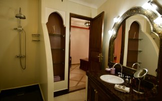 Our Suite Koutoubia pays homage to these warm, enveloping tones that define Marrakech's architectural identity. The suite's color scheme of reds, oranges, and ochres creates the same soothing, welcoming atmosphere that the mosque provides for the city. At 27m², the suite offers generous space and a cozy king-size bed, reflecting the Koutoubia's own balance between grandeur and intimacy. The option to connect with Suite Bahia creates an interesting duality—two spaces with contrasting color stories that work beautifully together, much like how the Koutoubia's warm stonework contrasts yet complements the blue Moroccan sky it reaches toward.