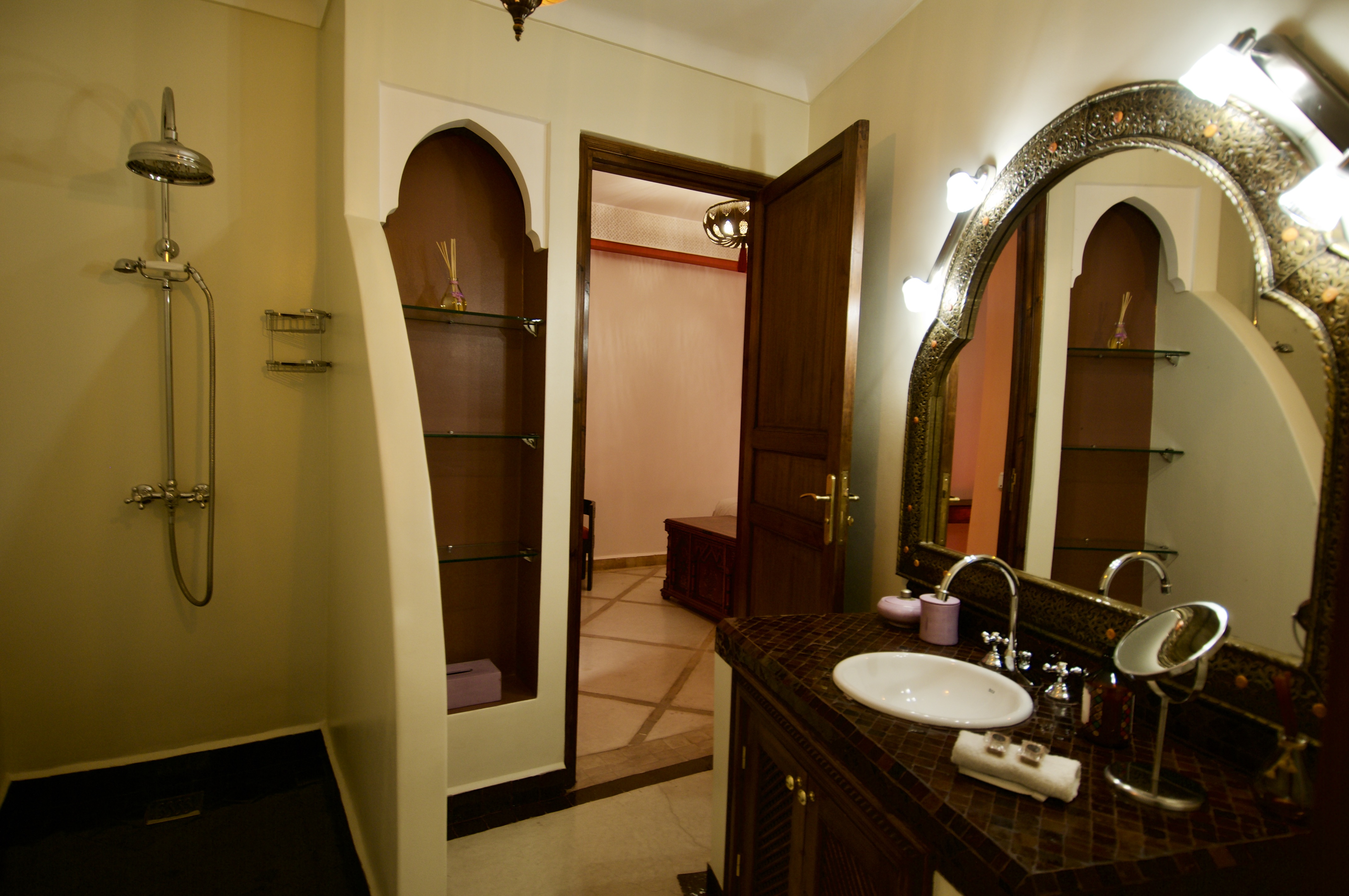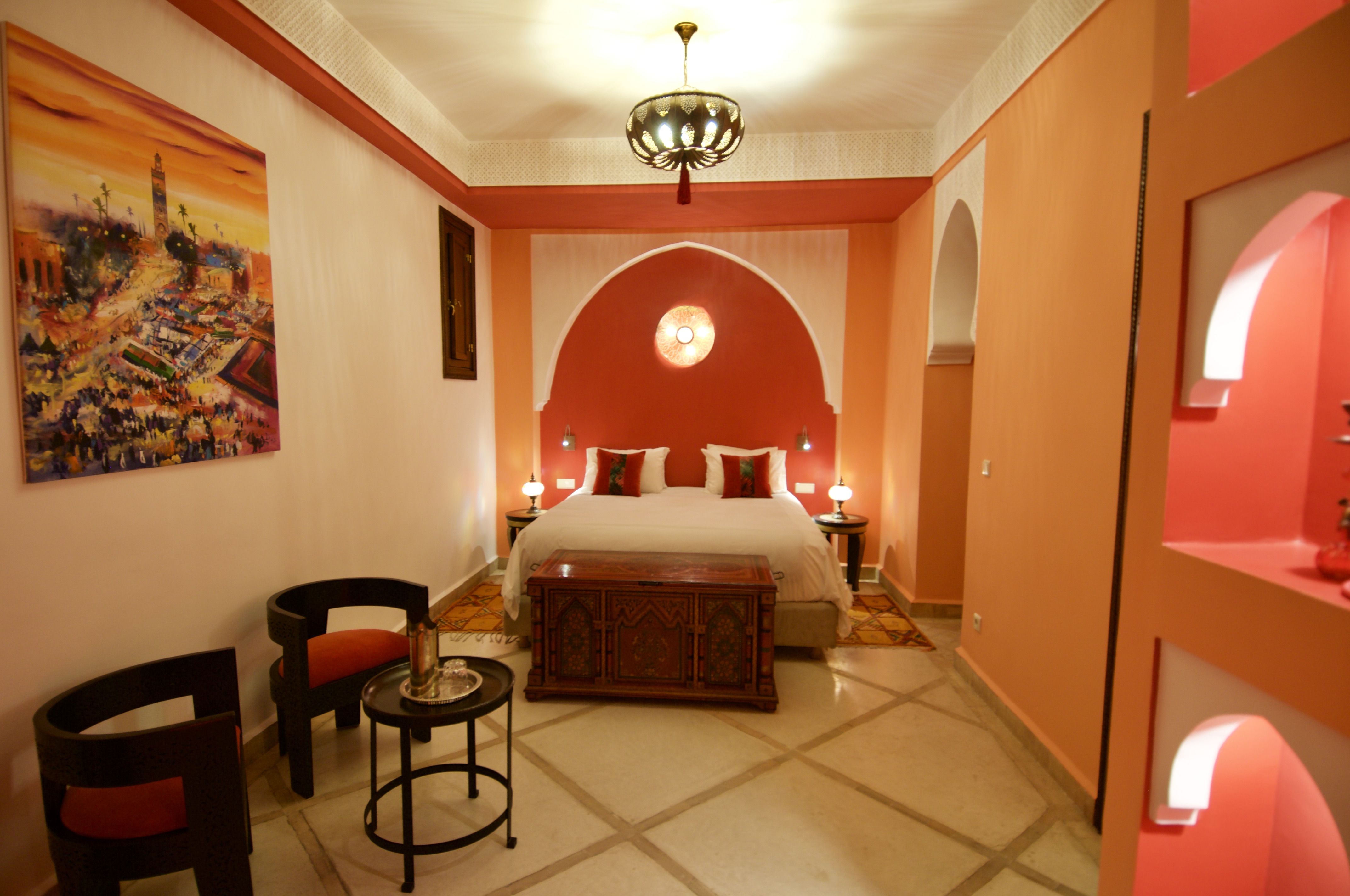 Notre Suite Koutoubia rend hommage à ces tons chauds et enveloppants qui définissent l'identité architecturale de Marrakech. La palette de couleurs rouges, oranges et ocres de la suite crée la même atmosphère apaisante et accueillante que la mosquée offre à la ville. Avec ses 27 m², la suite offre un espace généreux et un lit king size confortable, reflétant l'équilibre propre à la Koutoubia entre grandeur et intimité. La possibilité de connexion avec la Suite Bahia crée une dualité intéressante – deux espaces aux histoires de couleurs contrastées qui fonctionnent merveilleusement ensemble, tout comme la pierre chaude de la Koutoubia contraste et complète le ciel bleu marocain vers lequel elle s'élève.