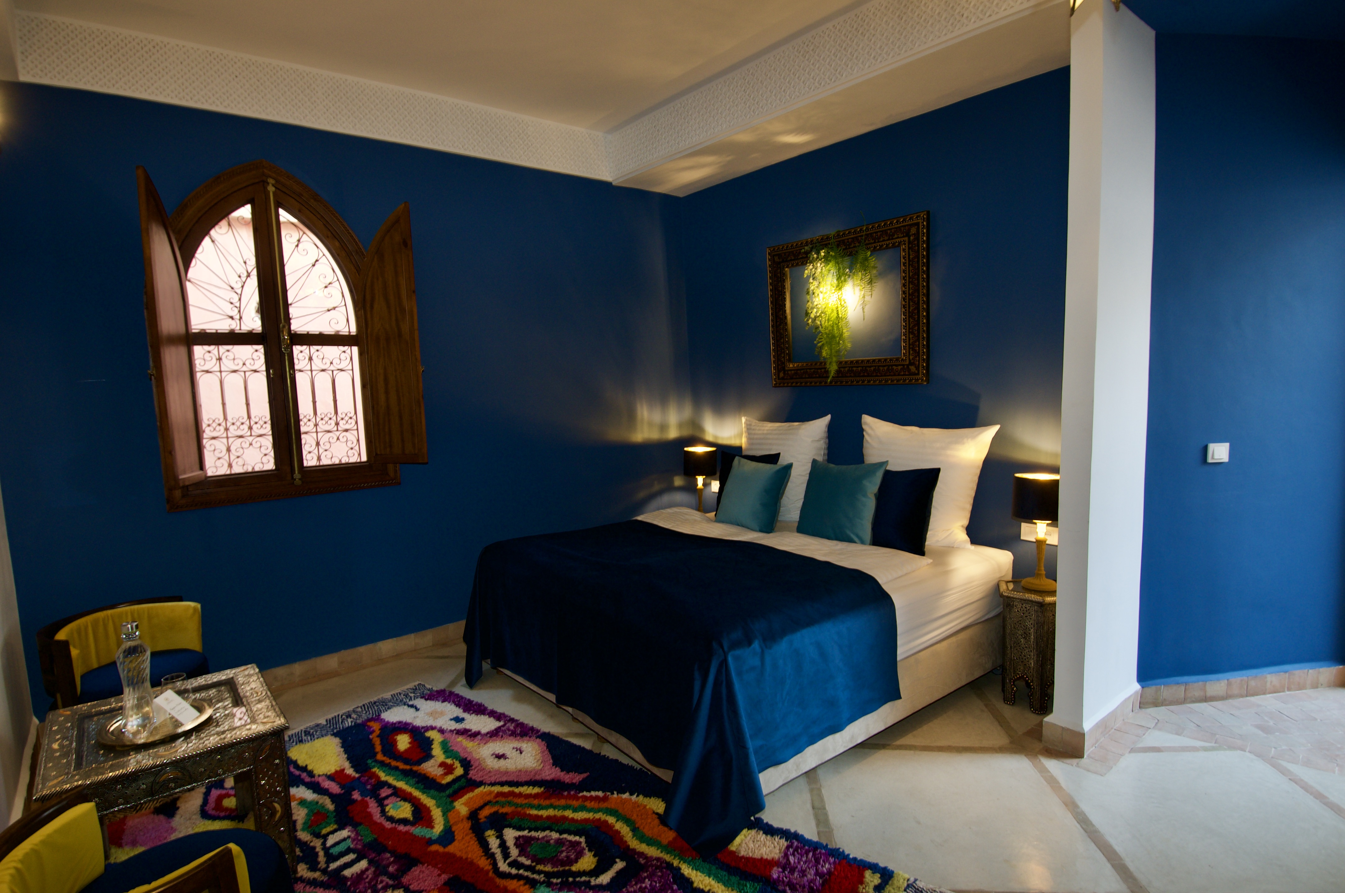 L'influence du jardin va au-delà de sa beauté physique – il représente un point de rencontre des cultures, une fusion de la vision artistique française avec l'artisanat marocain et la flore nord-africaine. Notre Suite Majorelle capture cet esprit de collaboration artistique et d'appréciation culturelle. Les éléments de design colorés et l'agencement réfléchi de la suite reflètent à la fois les choix esthétiques audacieux de Majorelle et l'élégance raffinée d'Yves Saint Laurent, créant un espace où l'art, la nature et le confort convergent. Parfaite pour les couples ou les amis voyageant ensemble, elle incarne l'esprit accueillant et créatif qui a fait du jardin lui-même un sanctuaire pour les artistes et les rêveurs.